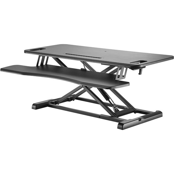 The EDT-S28.2N black manual sit to stand desktop workstation incorporates an effortless gas lift structure to create an ergonomic worksurface - The easy-to-operate squeeze handle creates smooth and quick transitions between sitting or standing
