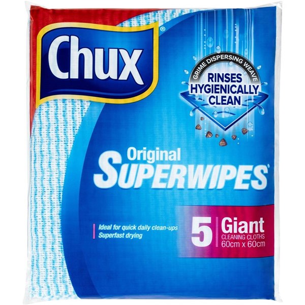 • Chux Giant Superwipes are made from a special open weave cloth. The double action holes easily pick up dirt and food particles and allow for the cloth to be hygienically rinsed clean for use over and over again