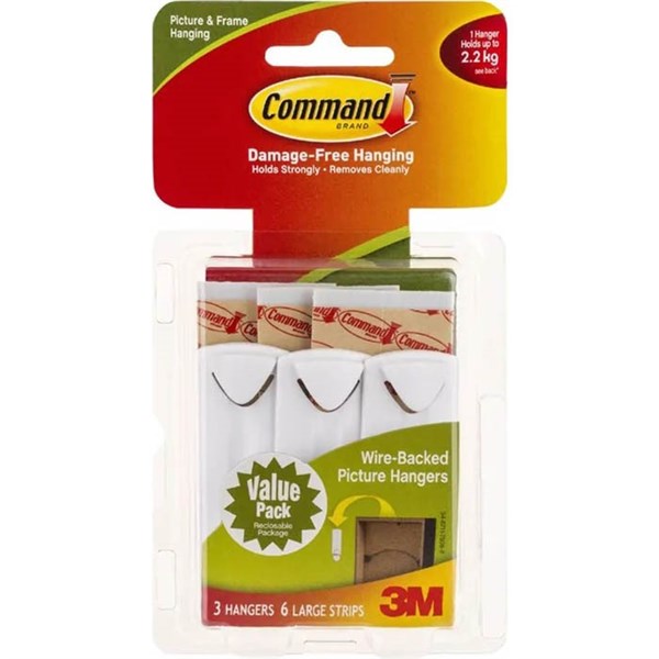 COMMAND ADHESIVE PICTURE HANGERS WIRE-BACKED WHITE VALUE PACK 3 HANGERS AND 6 STRIPS