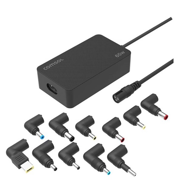 the Comsol Universal Laptop Charger with 11 Tips 65W Black DC65CAB is designed to provide reliable and efficient charging for a wide range of laptops from multiple brands using a single universal adapter - It comes with 11 interchangeable tips to fit various laptop models, making it a versatile solution for home, office, or travel use