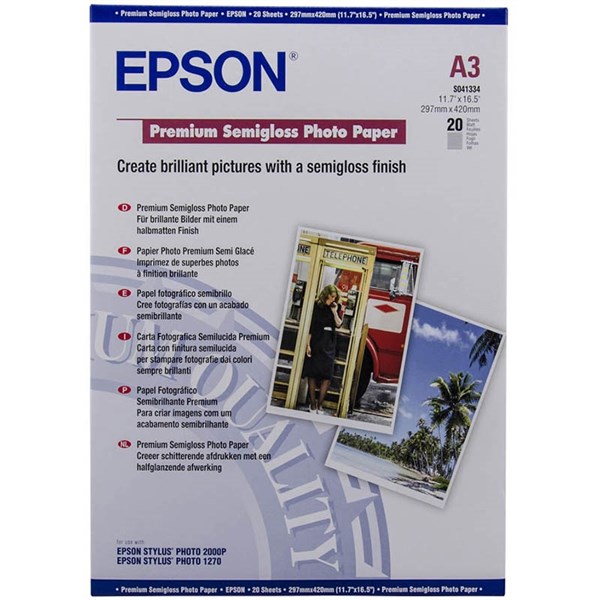 EPSON S041334 PREMIUM SEMIGLOSS PHOTO PAPER 250GSM A3 WHITE PACK 20