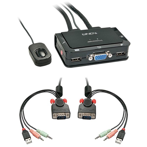Switch between 2 computers with VGA connection with only one keyboard, mouse and monitor - The Lindy 2 Port VGA, USB 2.0 & Audio KVM Switch is a compact solution for providing access and control over two VGA equipped PCs from a single keyboard, mouse and monitor. With integrated cables, this switch can be easily connected directly to the system, with no need for purchasing additional cables and saving time on the installation