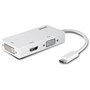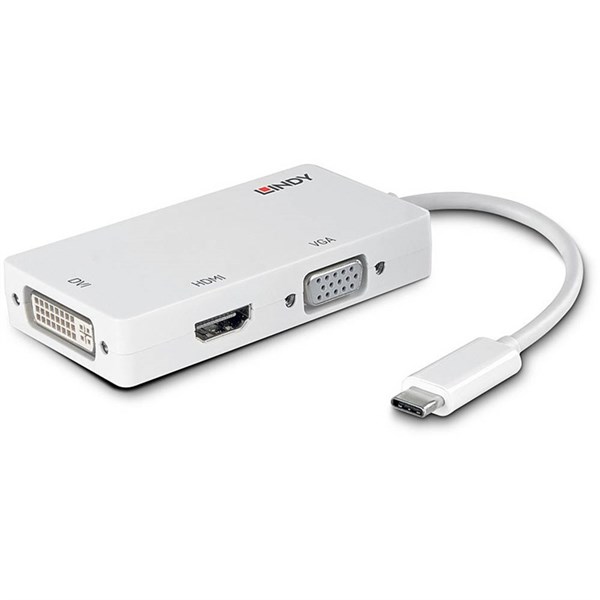 The Lindy USB Type C to Triple Display Converter allows users to connect either an HDMI, DVI or VGA screen to a Macbook, ultrabook or notebook with USB DisplayPort Alternate Mode. With its lightweight, low profile design, the adapter easily fits into a notebook bag and simply expands any available connectivity options, so users can connect to the most commonly used digital and analogue video equipment, without having to carry multiple adapters - ideal for BYOD applications - The converter is powered by the USB Bus, therefore no external power supply is needed. Installation is simple as no drivers are required and Type-C's reversible design has been developed to work regardless of which way the cable is inserted into the port