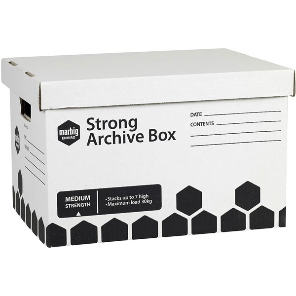 The Marbig archive box range is perfect for all your archiving needs - Double end walls and double layer base provides superior stacking strength - up to 7 high
