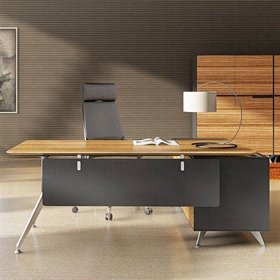 Executive desk in high quality Zebrano real wood veneer. Features large side return with European close and open mechanism - Shark nose edging