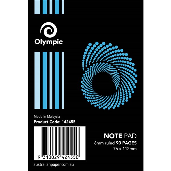OLYMPIC SP60 NOTEPAD SPIRAL BOUND 8MM RULED 90 PAGE 76 X 112MM WHITE