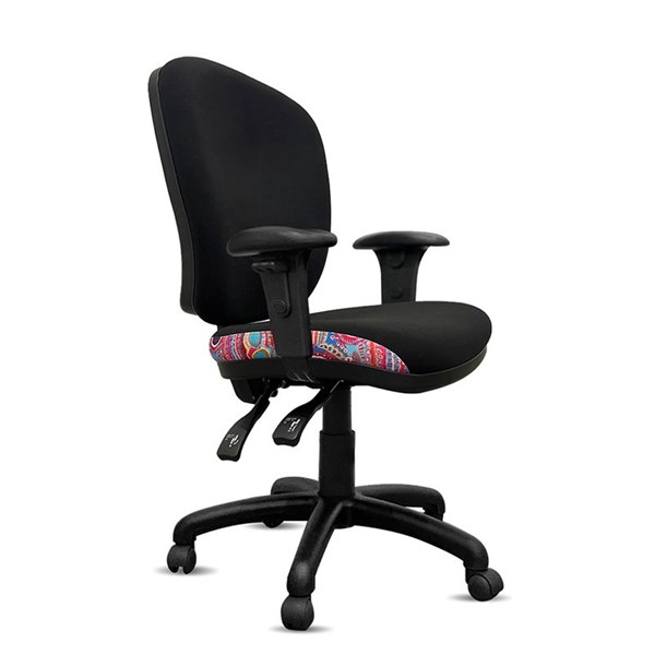 - A unique commercial fabrics designed by Nelly Patterson (Indigenous Artist) combined with K2 black fabric to upholster the chair