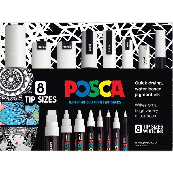 POSCA PAINT MARKERS ASSORTED TIP SIZES WHITE PACK 8