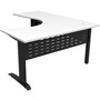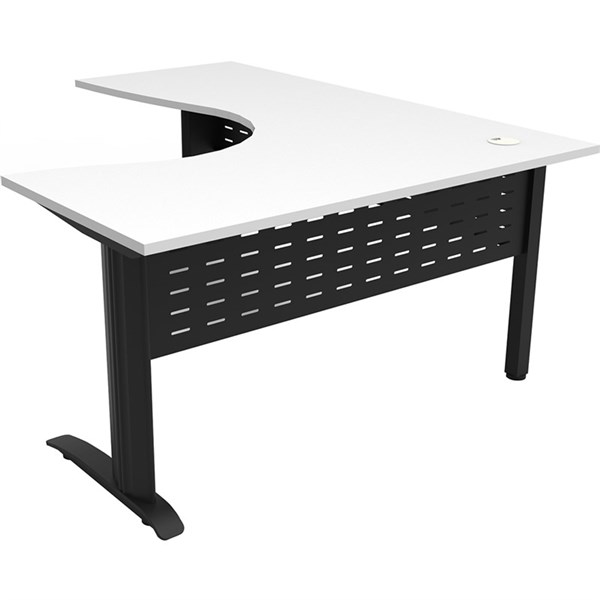 The Rapid Span Corner Desk features a 25mm melamine top with cable entries, metal legs and perforated modesty panel - The desk top is universal, this means when you assemble the desk, you can have the short side on the right or on the left, whatever suits