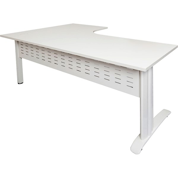 The Rapid Span Corner Desk features a 25mm melamine top with cable entries, metal legs and perforated modesty panel - The desk top is universal, this means when you assemble the desk, you can have the short side on the right or on the left, whatever suits