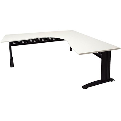 The Rapid Span Corner Desk features a 25mm melamine top with cable entries, metal legs and perforated modesty panel - The desk top is universal, this means when you assemble the desk, you can have the short side on the right or on the left, whatever suits