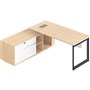- The included side cabinet provides ample storage with lockable drawers, a cupboard, and open shelf compartments