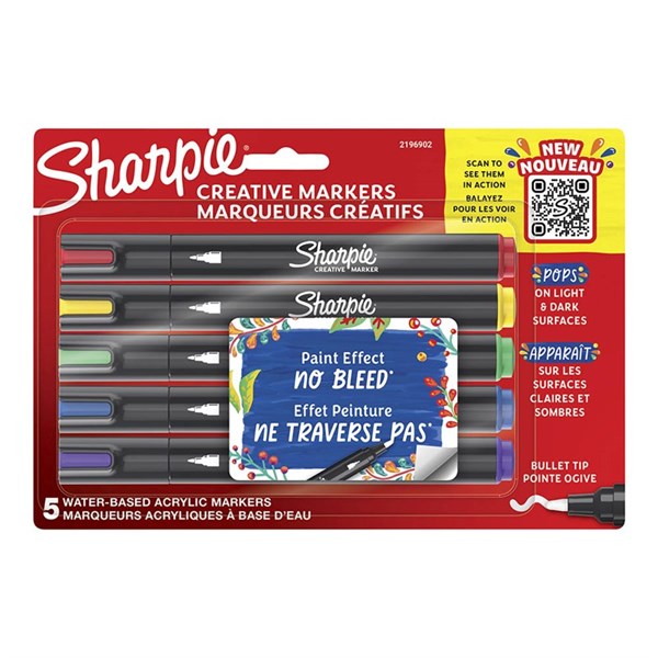 SHARPIE CREATIVE WATER-BASED ACRYLIC MARKERS BULLET TIP ASSORTED COLOURS PACK 5