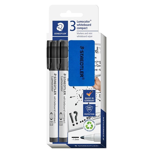 STAEDTLER LUMOCOLOR WHITEBOARD COMPACT BULLET POINT MARKER PLUS ERASER BLACK PACK 2