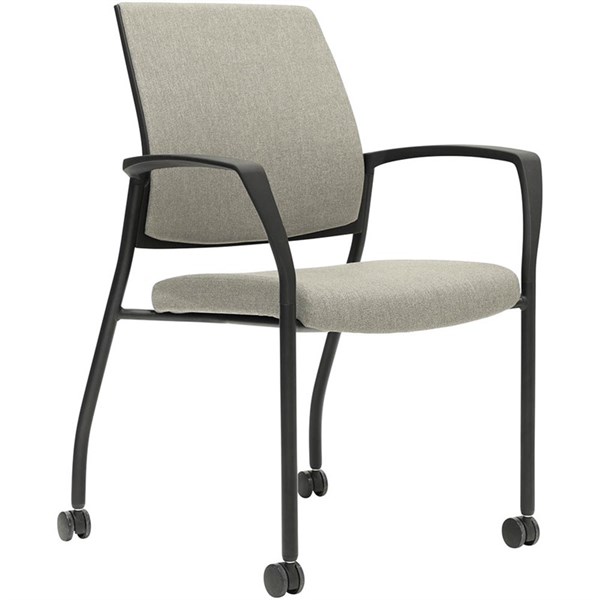 Urbin multi-purpose stackable armchair with upholstered inner and outer back and upholstered padded seat - Fully welded black powdercoat 4 leg steel frame on castors