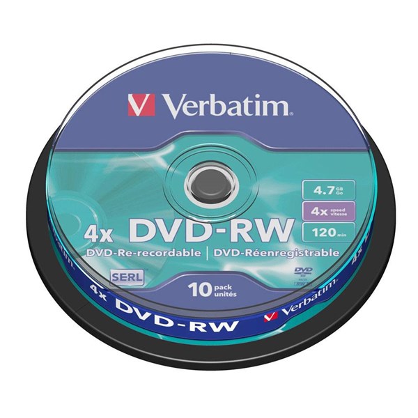 The Verbatim DVD-RW 4.7GB 10 Pack Spindle (43552) offers high-quality, rewritable storage for video, data, and backup applications - Each disc provides 4.7GB of capacity and can be rewritten multiple times without compromising performance