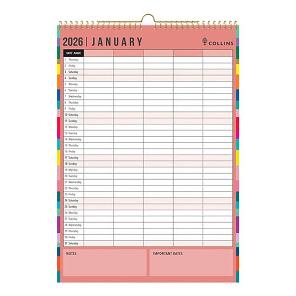 Keep the whole family organised and plan your time in style with the Collins Edge Rainbow Mira Family Wall Calendars - Each month has a space for up to 5 family members