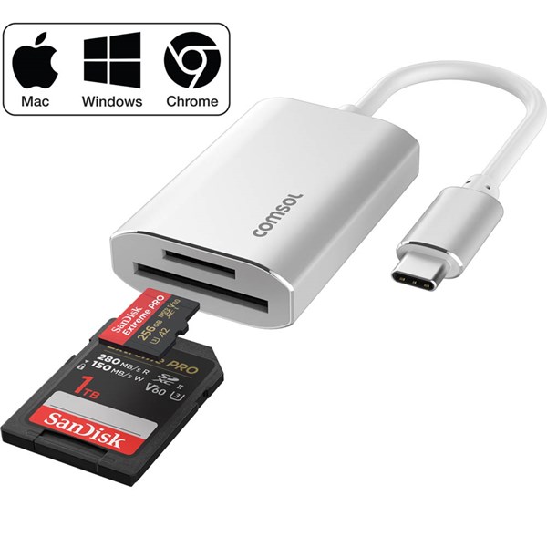 The Comsol USB-C to SD Reader and Micro SD4.0 Reader White CMSD40 is designed to provide fast and convenient access to SD and microSD cards from USB-C enabled devices such as laptops, tablets, and smartphones