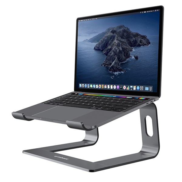 The Mbeat stage S1 elevated laptop stand is crafted from durable aluminum alloy with a silicon grip, designed to reduce eye and neck strain while enhancing airflow to keep your laptop cool - It's thoughtful design allows for organized workspace storage beneath the laptop, making it an essential accessory for productivity and comfort