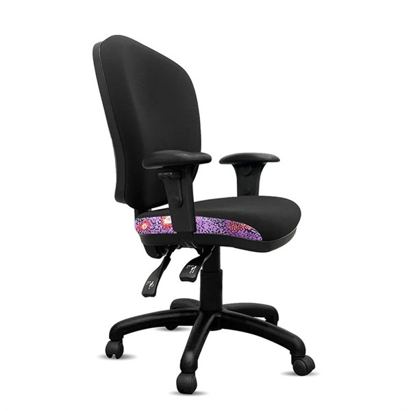 - A unique commercial fabrics designed by Nelly Patterson (Indigenous Artist) combined with K2 black fabric to upholster the chair